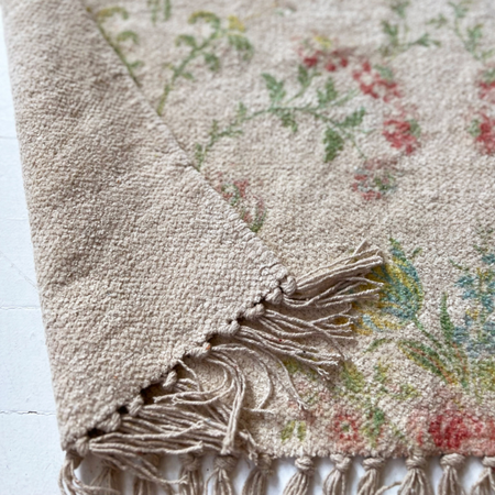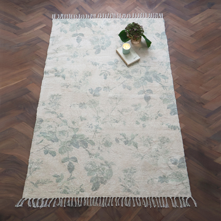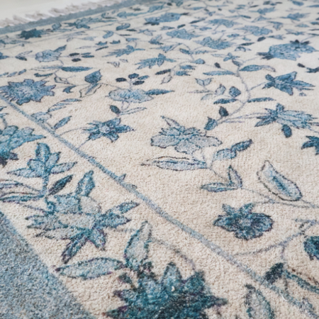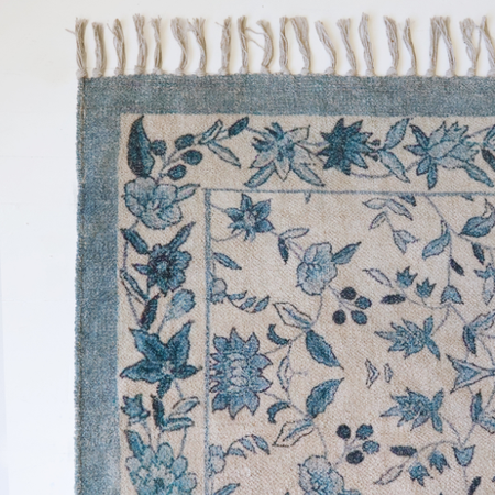 Our Delft Blue Floral Rug, a recent favourite among customers, beautifully balances refined simplicity with whimsical chinoiserie-inspired florals. Featuring a cascade of pale and rich blue blooms framed by an inset border and finished with relaxed tassel edges, this cotton rug captures the textured charm of traditional Indian block-printing. The blue tones, evocative of 17th-century chinaware, lend a sense of vintage elegance and timeless appeal to any space. The composition of this rug is thick enough to provide comfort underfoot, yet not so plush that it compromises practicality, making it well-suited for placement beneath furniture.