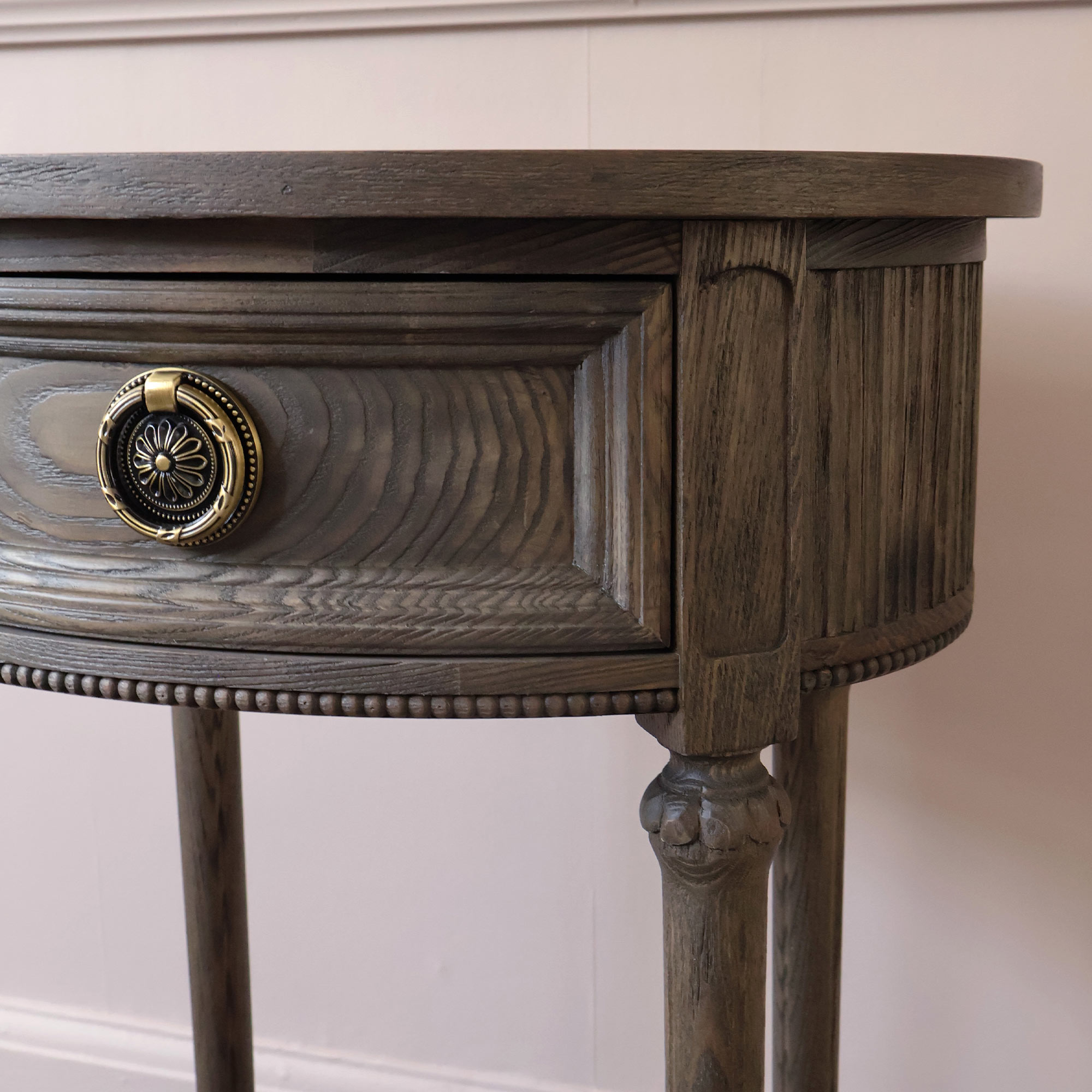 The Gustavian Oval Nightstand is characterised by vertical fluting to the sides and back. The tall, slightly turned legs have been tapered and gently fluted, referencing classic columns found in historical architecture. Acorn finials adorn the tops of the legs to create visual intrigue and contrast to the carved linear panels that sit beside the drawer. Fine, hand-carved pearl beading finishes the body of the bedside table, and the oval top is finished with a small 'lip' or rim, to ensure items don't easily slip off.