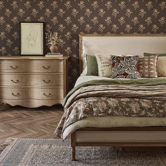 We are styling this oak chest with pale ceramics and dried grasses for a current and contemporary vibe. Alternatively, pair this versatile bedroom chest with more classic go-withs, such as French mirrors, antique china and a chandelier overhead.
