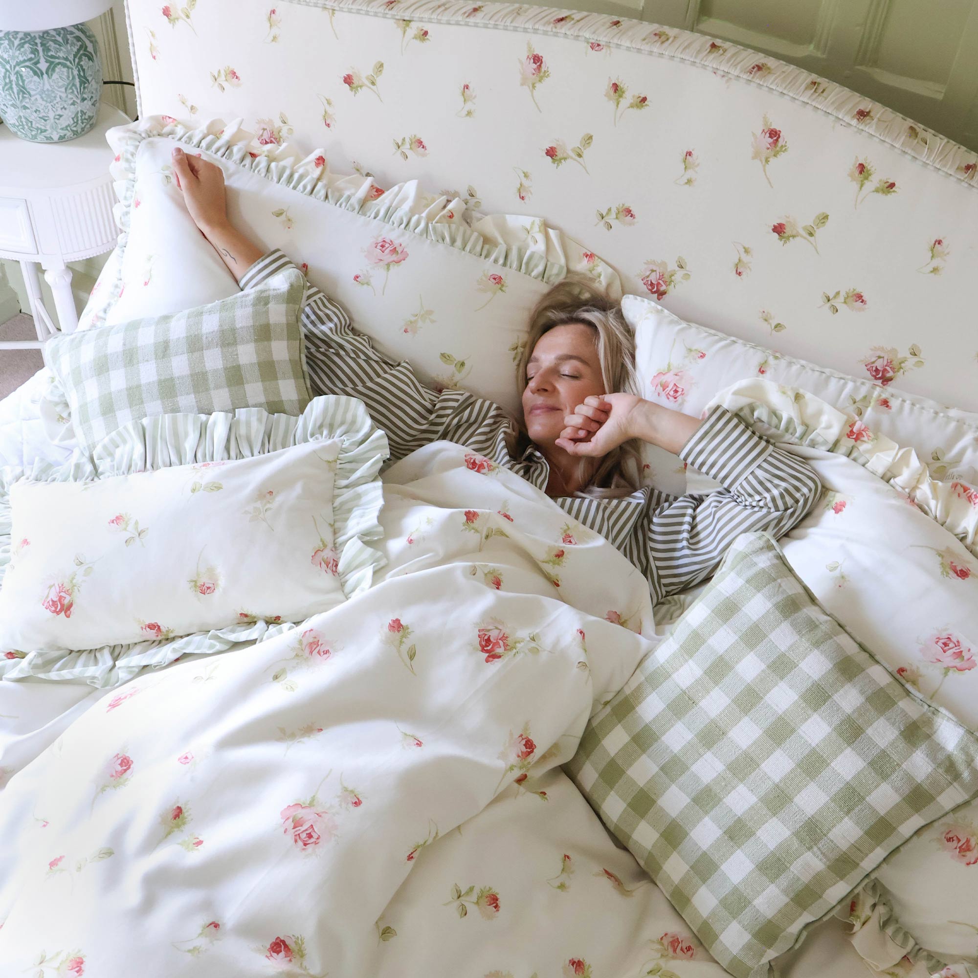 Ditsy Floral Bed Linen with Double Ruffle Detail in Matching Fabric and a Contemporary Sage Green Ticking Stripe