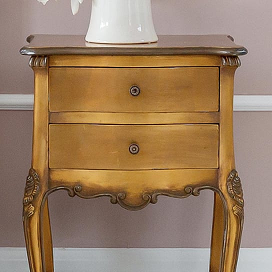 An antiquated gilt mahogany two-drawer bedside table with pretty yet subtle hand carvings and cabriole legs.
