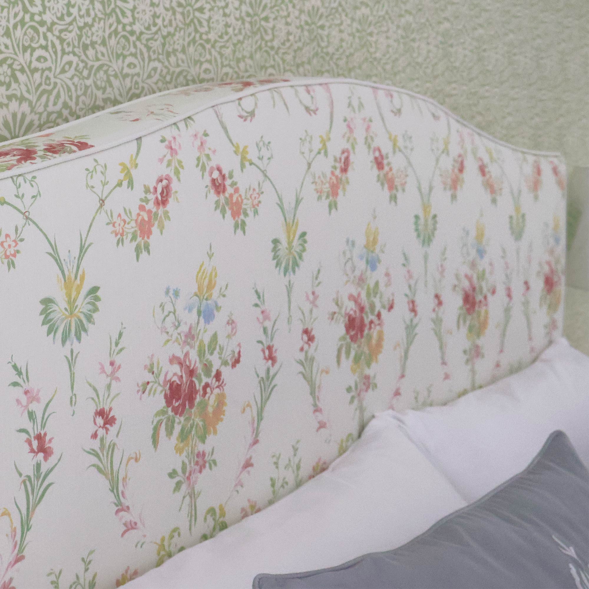 Designed by our team in Sussex, the bed captures the resurgence of Royalcore styling. The floral design depicts an elegant, damask-like pattern from the early 19th Century, adorned with delicate garlands of roses, lilies and cornflowers, together with ornate scrolls.